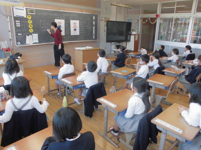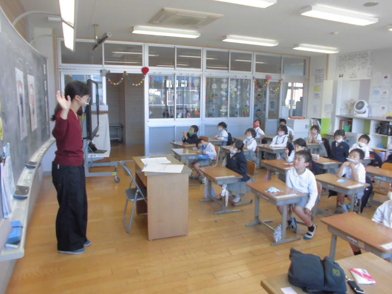 1年生は、ALTエイミー先生と英語活動を楽しみました。みんな元気いっぱいです。発音がgood!