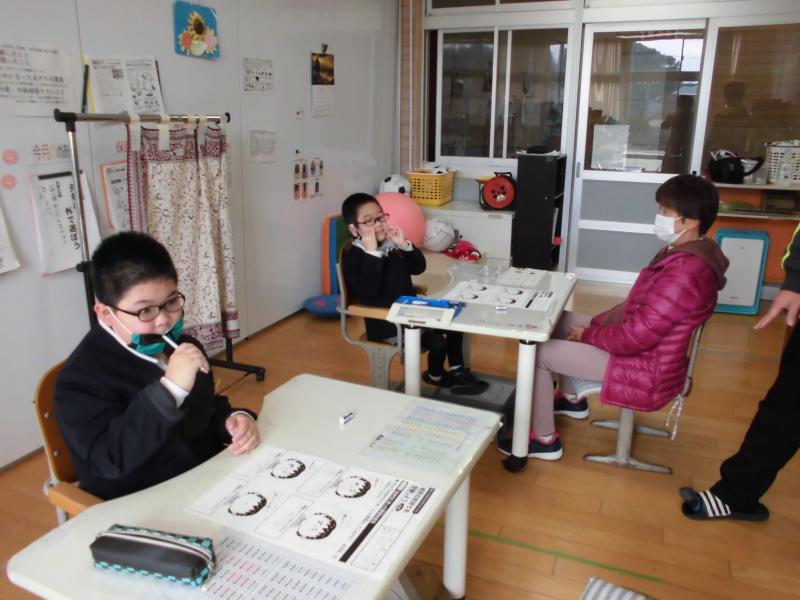 今日はひまわり2組の研究授業でした。ひまわり学級では一人一人のニーズに応じたきめ細やかな学習指導が行われます。今日の学習内容は、目の体操、指の体操など、視線と体の動きのトレーニングが中心でした。ひまわり学級の授業はいつも明るい雰囲気の中行われます。今日も先生達2人と、こどもたち2人の笑顔あふれる時間になりました。