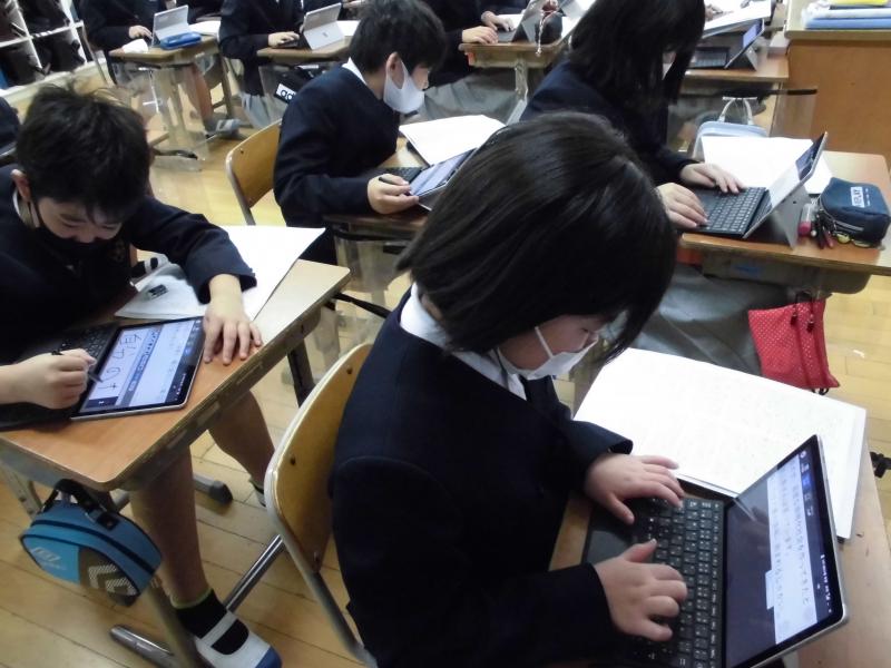 5年生の学習態度は、本当にすばらしいです。よく考え、よく発表します。自分の考えをICTを使って説明しています。