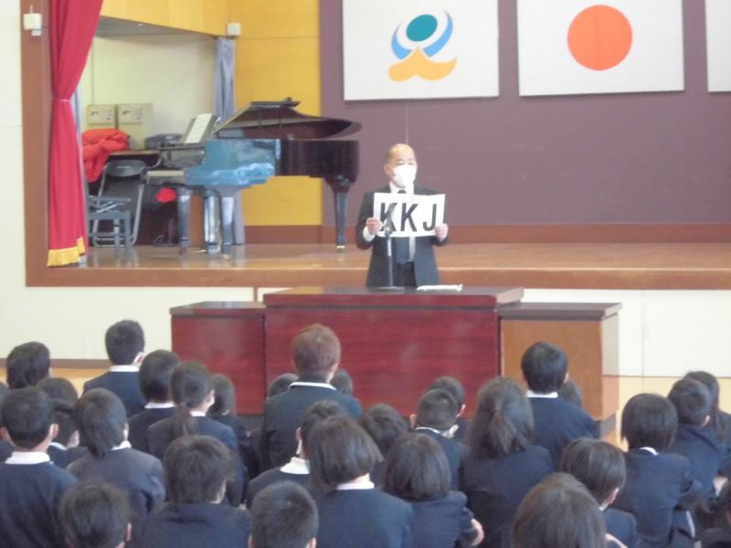 始業式の様子です。令和3年度も合い言葉は「KKJ」。「気づき、考え、実行する」ことが大切です。