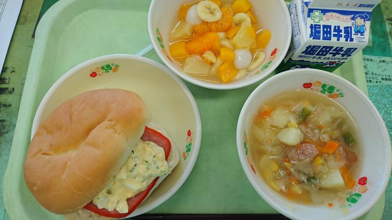 1日の献立は、ハムステーキバーガー、オニオンスープ、フルーツポンチでした。バーガーのハムの上にトッピングしてあるのは手作りのタルタルソースです。60個のゆで卵の殻をむくのは大変、、、かと思いきや、昨日の卵はするすると殻をむくことができ、スムーズに作業が進みました。玉ねぎのみじん切りは辛みを押さえるためにゆでて水けを絞りました。子どもたちからも「おいしい!」と好評でした。