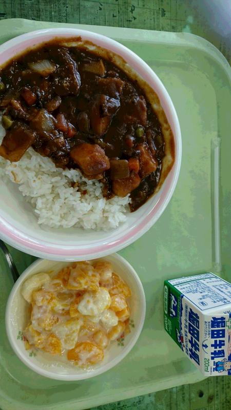 今日の給食は、ハヤシライス、フルーツヨーグルトでした。ハヤシライスは本来、薄切り牛肉(または豚肉)と玉ねぎをドミグラスソースやトマトソースで煮込んだものをごはんにかけて食べますが、学校給食では多くの野菜をとれるようにカレーと同じような具材にしています。