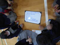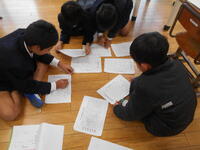 1つの点を中心にした拡大図のかき方を考えました。まず、三角形についてグループごとに考えたのですが、活動が始まるとともに話し合いを始めるグループもあれば、まずはじっくり一人一人で考え、その後話し合うグループもありました。図を指し示したりしながら説明する姿、アドバイスをする姿、分からないところを尋ねる姿など、共に学び合い、学びを深めることができました。相手に分かりやすく説明する力、説明の細部までこだわって聞き疑問を持つ力、ともに伸びています。今後さらに子どもたち自身による、みんなで高め合うクラスづくりができそうでたいへん楽しみです。