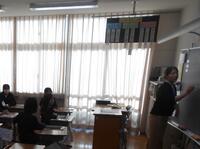 家庭科室で給食の説明を行い、1年生がとうもろこしの皮むきをした時と、給食ができる様子の動画をみていただきました。
