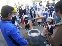 「もちつき体験」も地域の方に教えていただきました。参加した子ども全員が杵でもちをつき笑顔、もちを丸めて笑顔、きなこや砂糖醤油などのお好みの味で食べて笑顔となりました。保護者の方も参加してくださり、地域の方、子どもたちと共に一体感のあるもちつきとなりました。