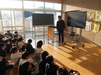 5年生が、龍ヶ岳から遠く離れた福岡にある自動車工場の見学を、オンラインで行いました。テレビの画面を通して、工場の方に自動車の製造工程や工場の特徴などの説明を聞きました。質問コーナーでは子どもたちの疑問にも答えていただきました。工場で働く人の数より機械やロボットの数の方が多いこと、たいへんな作業は塗装で、広い面はロボットが塗装をするが内側などの細かなところは人が行うことなど、子どもたちが初めて知ることも多く、学びを深めることができました。