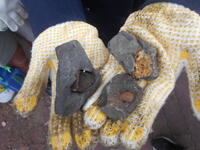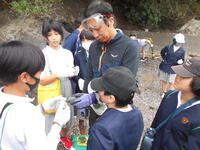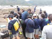 5・6年生が龍ヶ岳中学校のみなさんと一緒に、上天草市歴史講座で地層や化石の勉強をしました。講師の先生は、大道がご出身の九州大学大学院教授 尾上哲治先生でした。まず、龍ヶ岳山頂付近の白い石の層やその下の赤い石の層は5000年前の哺乳類の時代にできたこと、さらに下の黒い石の層は8500年前の恐竜の時代にできたことを教えてくださいました。次に、高戸海水浴場の先にある和田の鼻にフィールドワークへ出かけました。子どもたちは、化石のありそうな石を見つけてはハンマーで割ってもらって確かめたり、講師の先生に尋ねに行ったりしながら貝の化石などを探しました。中にはアンモナイトの化石を見つける子もいました。龍ヶ岳にかくされた地球の秘密を体感することができました。