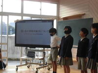 体育委員会が、子どもたちの体力について説明しました。先週は各クラスで一人一人の体力の状況について考えてもらっていましたが、今回は、学校全体について、グラフを見たりしながら考えました。これからも体育の授業や朝の活動などの時間に、龍っ子が楽しみながら体力向上できるよう子どもたちと教師で工夫していきたいと思います。また、今回の先生の話コーナーでは、天草のよいところを知って友達に紹介してほしいという願いが伝えられました。