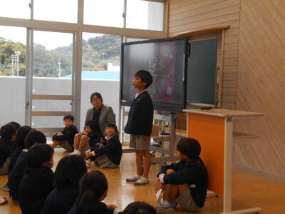 先日、4年生から授業参観の招待がありました。社会科で、自分が住んでいる地域のことを調べて伝えようという学習でした。大道地区(大道小)、樋島地区(樋島小)、高戸地区(高戸小)の3つが統合した龍ヶ岳小の校区は広く、実は、あまりお互いの地域のことが分かりません。そこで、今回の学習につながったのかな?と思います。大道の子は、龍ヶ岳ウォーク、高戸の子は、高戸の祭り、樋島の子は、子ども相撲、よく調べ、よくまとめ、よく練習した成果が見える発表でした。4年生の子供たちの龍ヶ岳への思いがまた膨らんだ学習となったようです。すばらしい4年生!!