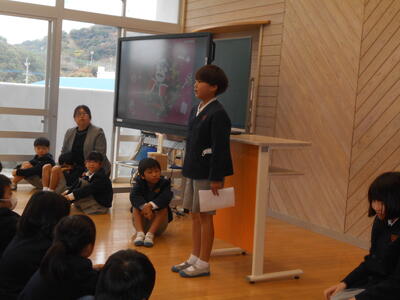 5・6年生が、台湾新北市瑞芳区の瑞亭國小学校の5・6年生とオンラインで交流しました。まず、瑞亭國小学校の子どもたちから自己紹介です。生の中国語を聞くことができました。次は、龍ヶ岳小学校の発表です。5年生は、龍ヶ岳や上天草市の名所や特産物、龍ヶ岳小学校などの紹介をしました。6年生は、人吉や球磨などの熊本県内の地域を紹介しました。みんなとても上手に発表できました。最後に、質問コーナーです。子どもたちは、質問や答えをしっかり聞いて、自分の分かる言葉がないか探し出していました。中国語で「好きな曲は何ですか?」と質問することにチャレンジした子もいました。