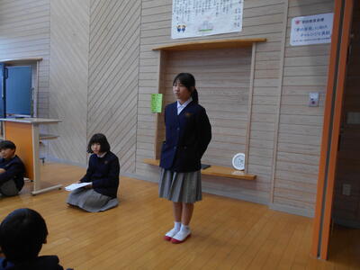 郡市音楽会に出場する3、4年生と中学生で、演奏の交流を行いました。小学生はドキドキの緊張感の中、練習の成果が出ており、とてもきれいな歌声でした。中学生からもたくさん誉められて自信にもつながりました。6年生は、今後の学習(総合的な学習の時間)につなげるために、中学生の「龍神太鼓」を3、4年生と一緒に聴きました。迫力ある演奏に、「かっこいい」「自分たちにできるかな」等の感想がありました。「締太鼓のこつを教えてください」という質問をした子もいました。