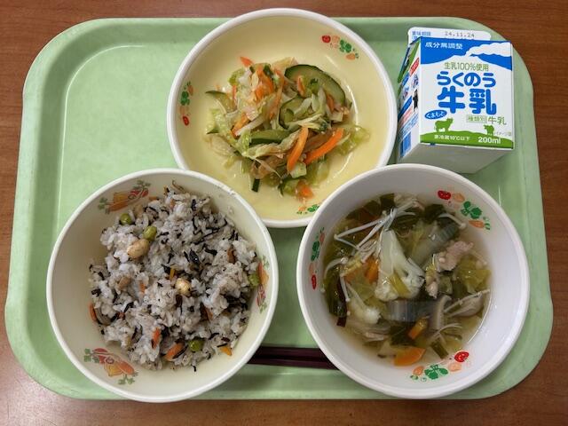 11月11日(月)ひじきご飯、牛乳、ごま酢和え、白菜のうすくず汁
