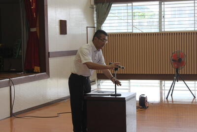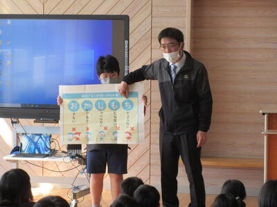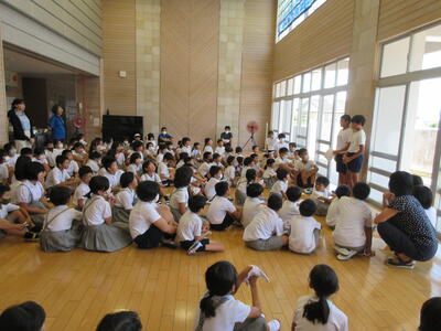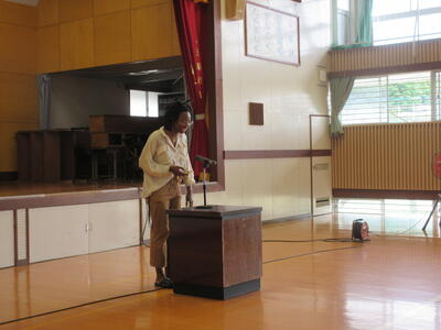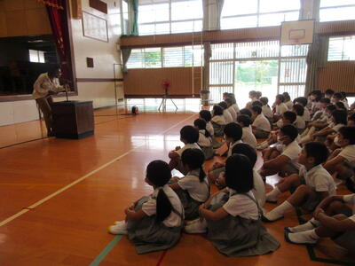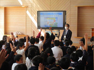 最後に、ホールで担当職員の話と校長先生からの話がありました。「お・か・し・も・ち」(押さない・かけない・しゃべらない・もどらない・近寄らない)の説明を聞いたり、防災クイズに答えたりして、正しい知識を改めて確認することができました。また、お家の方とも地震や津波の時にどこに避難するのか等の話をするようにも伝えられました。