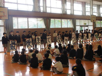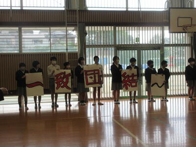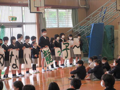 まず、4~6年生から、今年度の運動会スローガンの発表がありました。「一致団結~最後まであきらめない龍っ子~」です。なぜこのスローガンに決まったのか、どのような思いがあるのか等、はっきりと分かりやすく伝えることができました。