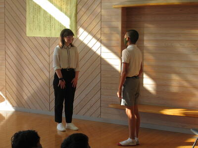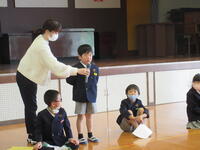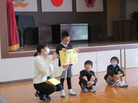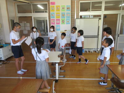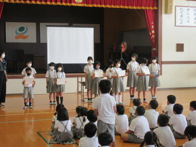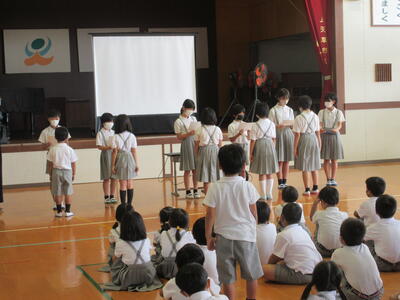 まずは、1年生の自己紹介です。全員自分の名前と好きなものを発表することができました。とても上手でした。