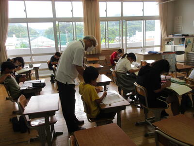 地震発生の放送が流れると、子どもたちは机の下に避難しました。その後の放送で、運動場へ、そして、津波警報発令の報告後、校舎3階へ避難しました。運動場から校舎へ避難する時は、6年生は1年生を、5年生は2年生の手を引いて移動しました。全員真剣に取り組むことができました。
