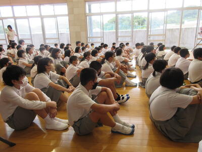 スタートの今日は、体育館に集まってみんなで龍ヶ岳小学校のみんなが笑顔で過ごすためにどうしたらよいかについて話し合う時間をもちました。