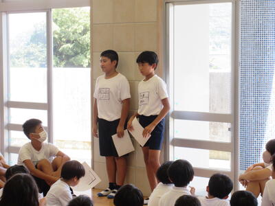 朝の時間に児童集会を行いました。この日は生活安全委員会の発表でした。