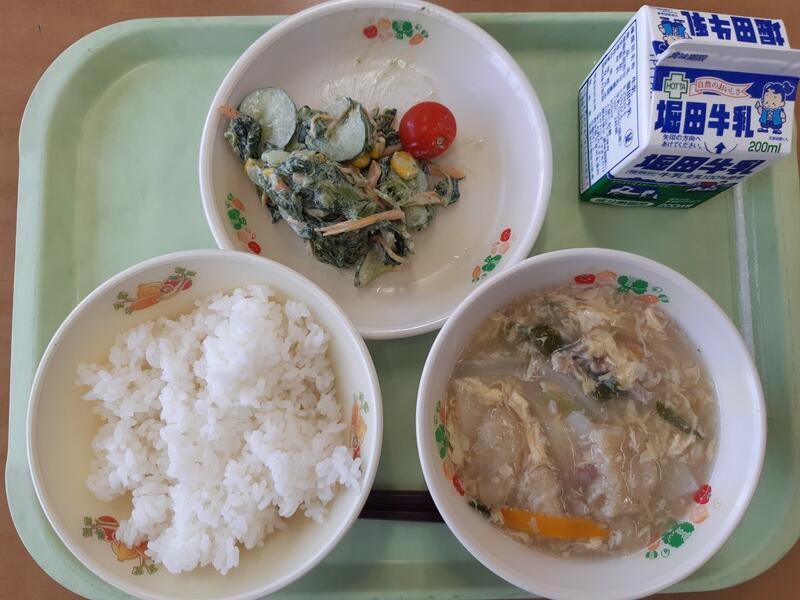 6月21日(水) 南関揚げ丼、牛乳、ほうれん草サラダ、ミニトマト
