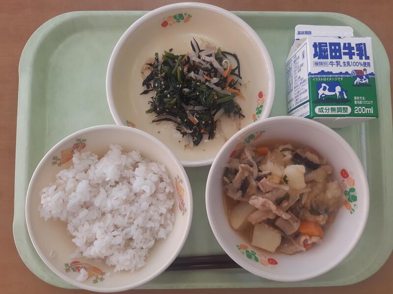 6月26日(月)麦ごはん、牛乳、いわし生姜煮、おかか和え、ピリ辛豚汁
