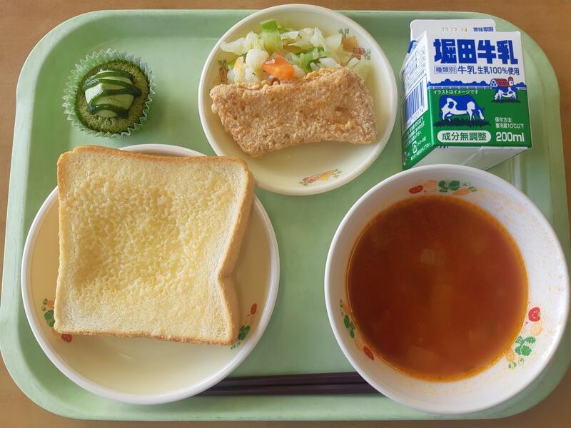 7月4日(火) カレートースト、牛乳、夏野菜ミネストローネ、枝豆サラダ