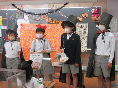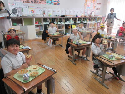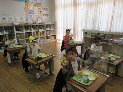 1年生は、仮装をして給食を食べました。また、6年生がドラキュラに仮装をして、各学級にかぼちゃプリンを配ってくれました。