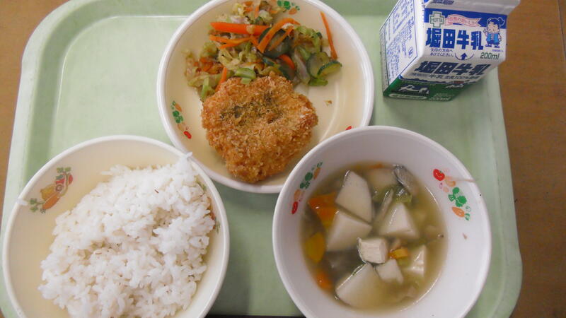 今日の献立は、麦ごはん、ヒレカツ、いわしの梅フライ、かつおあえ、みそ汁でした。ヒレカツは今月の食材レスキューで2月に賞味期限を迎える物でした。今月もお助け完了です!6年生が「今日は揚げ物が二つもある!」と大喜びでした。