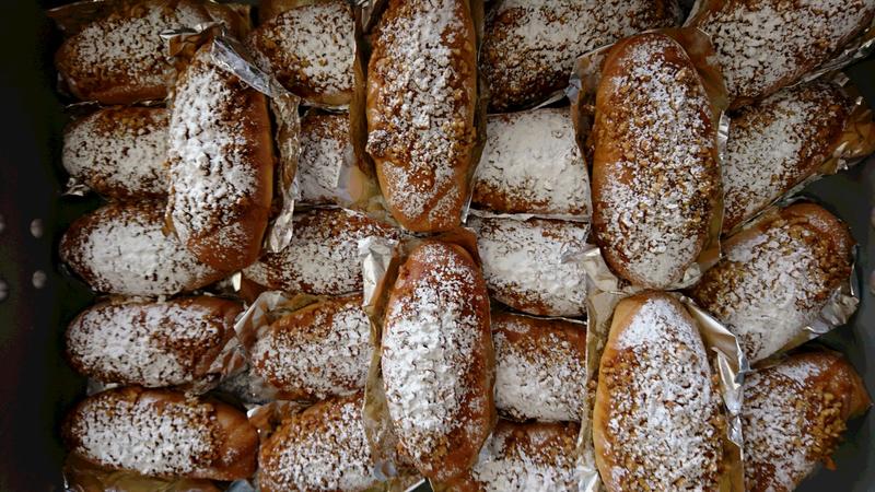 今日の献立は、シュトーレン、切り干し大根のポトフ、ブロッコリサラダでした。毎年恒例のクリスマスメニュー「シュトーレン」はドイツのクリスマス菓子です。給食ではコッペパンにマーガリンと黒糖、ナッツをねったものを塗って焼き、粉糖をふりかけました。本物は生地にナッツやドライフルーツが練り込んであり、硬く焼き上げてずっしりとしてます。クリスマスの2週間くらい前に用意して、一日一日クリスマスが近づくのを感じながら、薄くスライスして食べるそうです。(↓↓大きな口でパクっ!)