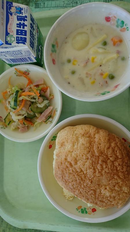 今日の献立は、手作りメロンパン、クリームシチュー、ツナサラダでした。手作りパンの難易度ランキング第一位のメロンパンは、子どもたちに大人気です。手作りパンの工程で一番重要なのは「発酵」です。今日は充分な発酵時間がとれ、ふっくら焼きたてのメロンパンを味わってもらいました。