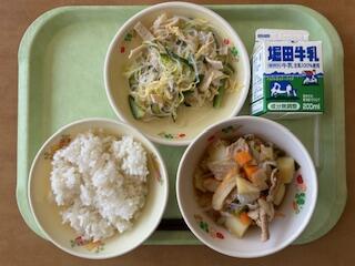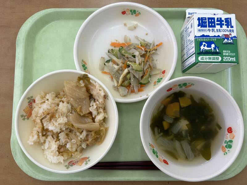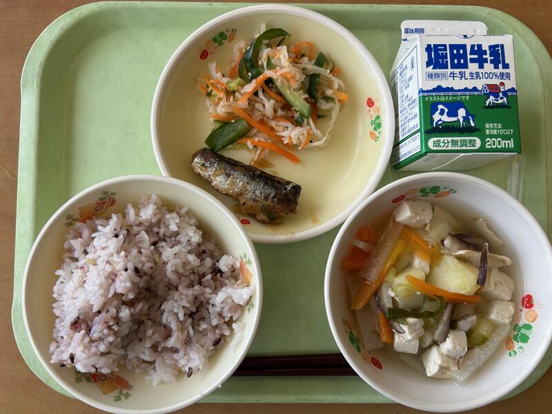 麦ごはん、牛乳、いわしの梅煮、切り干し大根の酢の物、けんちん汁