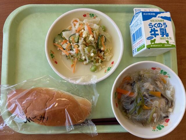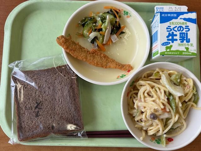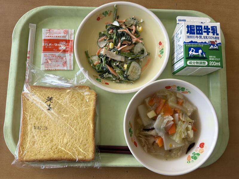 米粉入りにんじんパン、牛乳、八宝菜、ほうれん草サラダ、ミルメーク