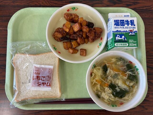 今日の給食は、今年度から実施した学校目標にあわせたKKJ給食の1回目でした。子どもたちが気づき・考え・実行するに合わせ、学習した内容や行事に合わせて実施する給食です。今回は、昨年度末に3年生が地域のちりめんについて学習し、簡単にできるレシピを考え、地域の方と調理しました。その中から「じゃこトースト」を取り入れました。進級した4年生も「私たちが考えた料理だ!」といって喜んで食べてくれました。