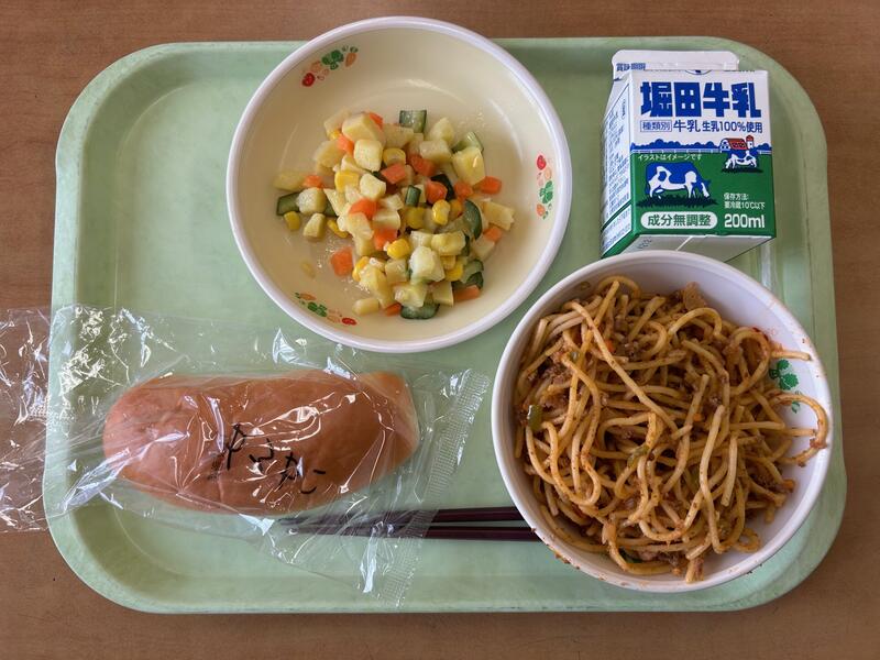ミルクパン、牛乳、スパゲティーミートソース、さつまいもサラダ