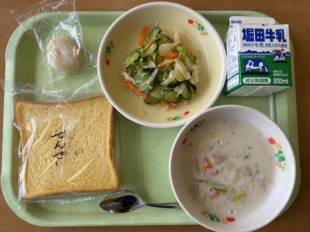 4月18日(木)食パン、牛乳、春野菜クリームシチュー、鉄分サラダ、いちごジャム