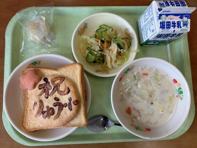 今日は、6年生には名前入りのお祝いパンを実施しました。病気でお休みの人がいて残念でしたが、「お祝いパン」を見た瞬間とっても喜んでくれて、作り手の私たちもうれしかったです。