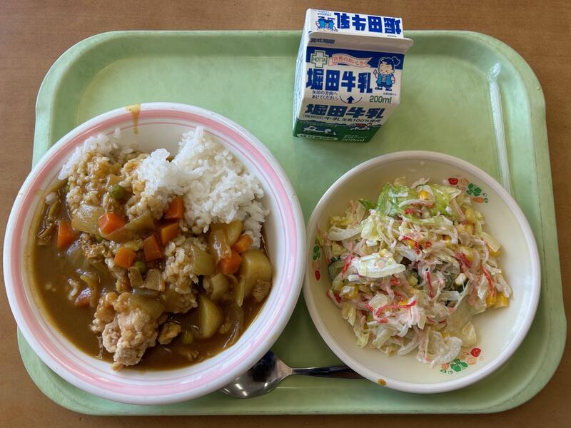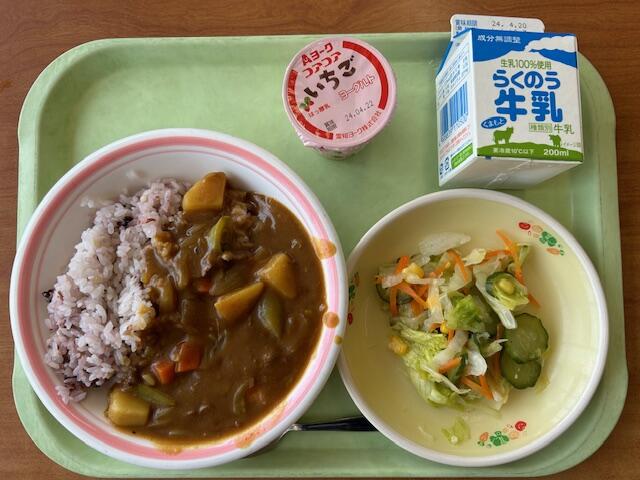 4月10日(水)お祝いカレーライス、牛乳、イタリアンドレッシングサラダ、ヨーグルト(いちご)