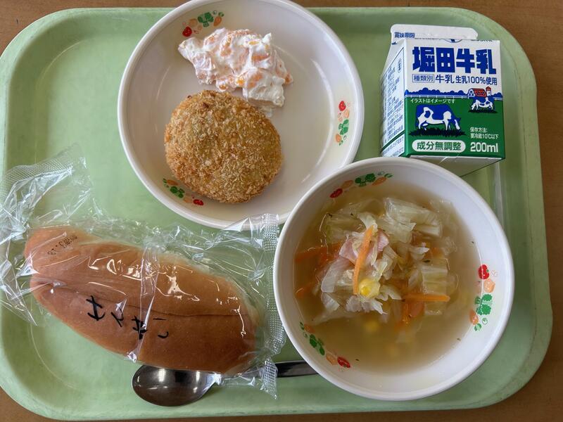 コッペパン、牛乳、冬野菜クリームシチュー、じゃこ豆サラダ、フルーツポンチ