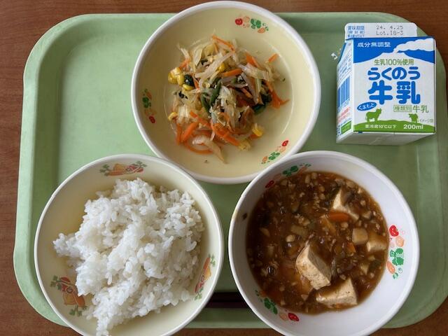 4月15日(月)麦ごはん、牛乳、豆入り麻婆豆腐、千草和え