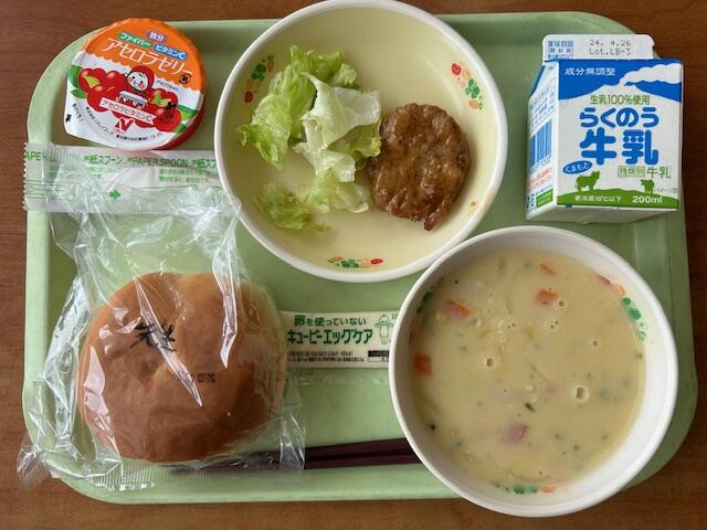 4月16日(火)セルフてりやきバーガー、牛乳、コーンポタージュ、アセロラゼリー