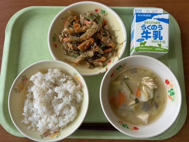 4月17日(水)麦ごはん、牛乳、豚肉と昆布の炒め物、さつま汁