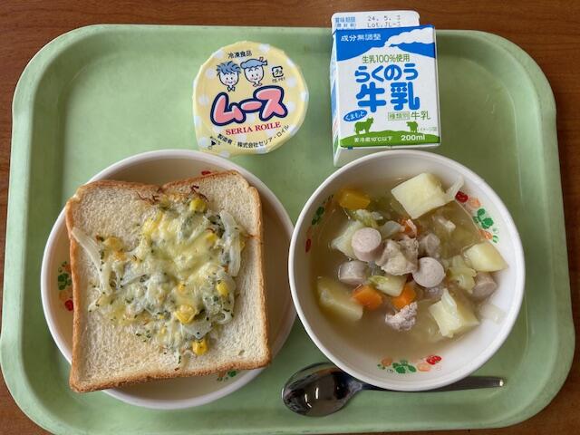 4月23日(火)★じゃこトースト、牛乳、春野菜ポトフ風煮込み、ムース