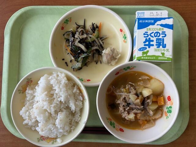今日は、季節のグリンピースを使ったグリンピースごはんを予定していましたが、不作や天草地区で作られているところが少ないということで、手に入りませんでした。1年生にさやむきをしてもらう予定でしたが、天候にはかないません。残念でしたが、わかめごはんに変更しました。6月にはとうもろこしの皮むきができるように準備したいと思います。
