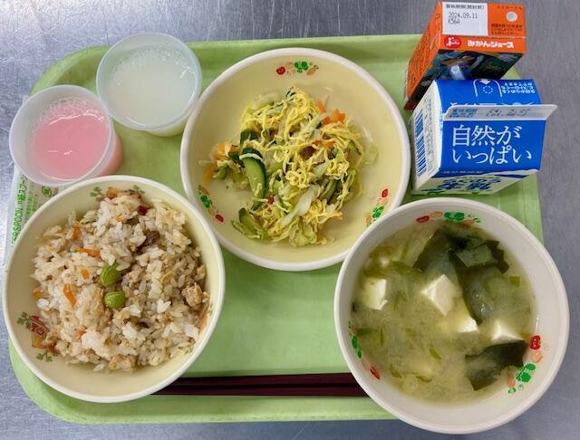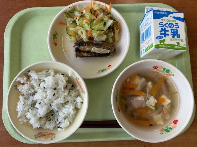 わかめご飯、牛乳、いわしの梅煮、酢の物、豆腐の五目スープ