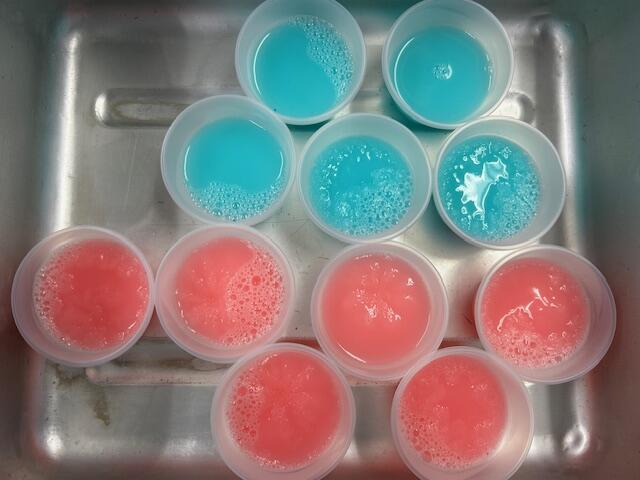 龍ヶ岳町のお豆腐屋さんの油あげで作るのが、おいしさの秘密でもあるようです。いつものご飯より、具が入ったので少し多くなりましたが、子どもたちは、パクパク食べていて、頼もしかったです。応援ゼリーも自分の団の色を食べて、「頑張るぞー!!」といっていました。