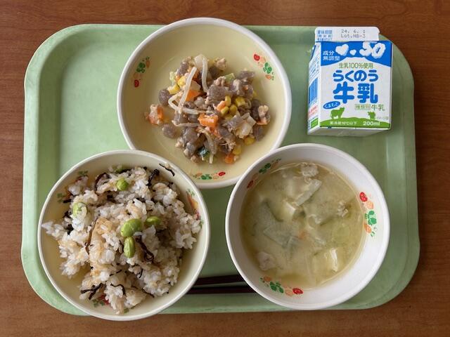 枝豆昆布ご飯、牛乳、こんにゃくサラダ、豚汁