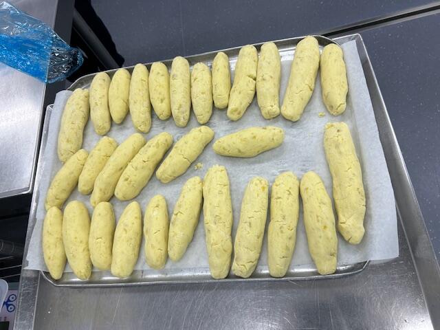 今回も食べやすいように、完成した揚げパンをたてにカットしてクラスにお届けしました。喜んで食べてくれました。