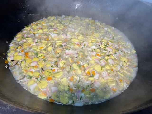 春キャベツ、新玉ねぎ、新じゃが、スナップえんどうの春が旬の野菜と春色のピンク色した鮭の角切りをシチューに入れて、彩りもきれいに仕上がりました。