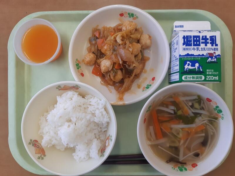 麦ごはん、牛乳、肉団子の甘酢あん、ビーフン汁