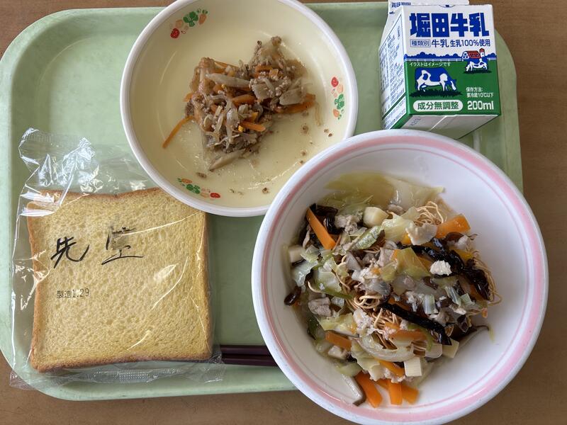 1月30日(火)米粉入りにんじんパン、牛乳、パリパリ焼きそば、浦上そぼろ