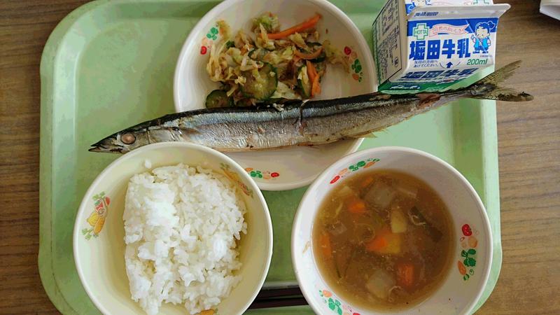 今日の献立は、ごはん、さんまの塩焼き、かつおあえ、のっぺ汁でした。今日のさんまは1~3年生は2分の1匹、4年生以上は丸ごと1匹でした。写真を見ていただくとわかる通り、お皿の直径の2倍近くの長さがあり、はみ出しています。大きなさんまに各教室で驚きの声があがりました。中にはどこからどう食べてよいかわからない子どもたちもいたようで、5年生の教室では先生が絵図を描いてはしの入れ方を説明してくださいました。加えて骨から身を外したものを実物投影機で電子黒板に映して指導してくださいました!が・・・食べた後の食缶を見ると、まだまだ身がついててもったいない・・・というものがいくつかあったようでした。。。上手に食べられるようになりましょう!